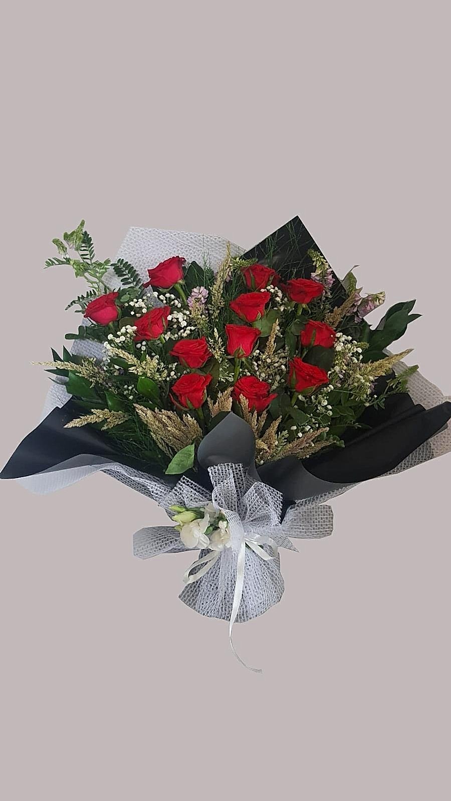 Ürünlerimiz 1. sınıf 12 adet kırmızı Gül ve mevsim yeşillikleri ile hazırlanmaktadır.